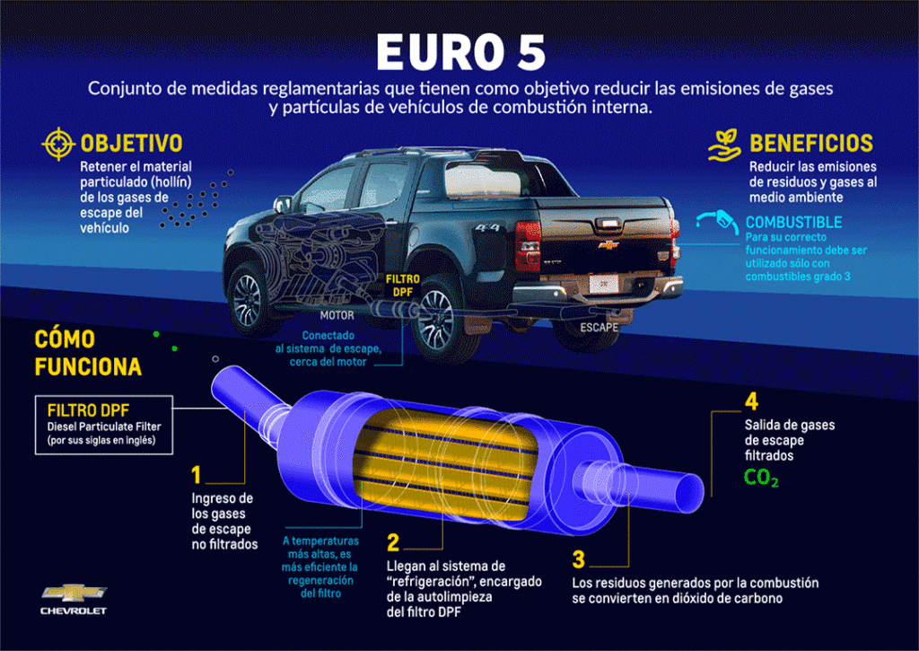 La Chevrolet S10 incorpora una nueva tecnología que reduce las emisiones contaminantes en los motores turbodiésel. Se trata del filtro de partículas DPF (Diesel Particulate Filter, por sus siglas en inglés), un dispositivo conectado al sistema de escape diseñado para retener el material particulado (hollín) de los gases de escape del vehículo, ayudando a preservar el medioambiente.