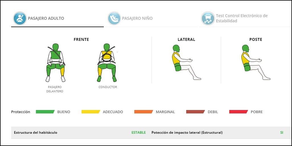 El modelo fue evaluado en impacto frontal, impacto lateral e impacto lateral de poste, en toda la gama del modelo. Las bolsas de aire de cabeza-tórax mostraron un rendimiento robusto en ambos impactos laterales. El Control Electrónico de Estabilidad -ESC-cumple con las condiciones de Latin NCAP.