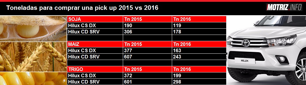 Para saber cuántas toneladas de soja, trigo o maíz se necesitan para comprar una unidad, tomamos como base dos modelos de la Toyota Hilux (la más vendida), siempre en versión 4×4, que sería la más útil para usar en el campo: