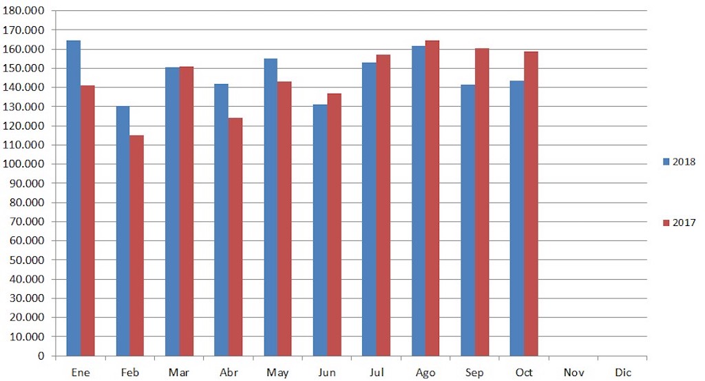 De esta manera, en el acumulado de los 10 primeros meses del año, el volumen llega a 1.474.283 unidades, un crecimiento del 1,48% con respecto a igual período del año pasado, cuando se vendieron 1.452.743 vehículos.