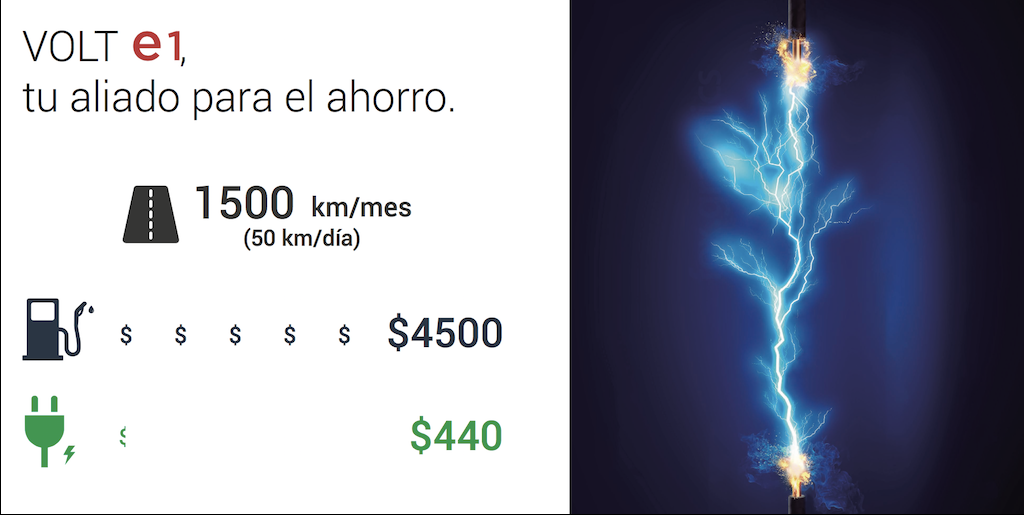 El Volt E1 tendrá baterías de litio que se pueden recargar en un tiempo máximo de 6 horas desde un enchufe de 220 voltios