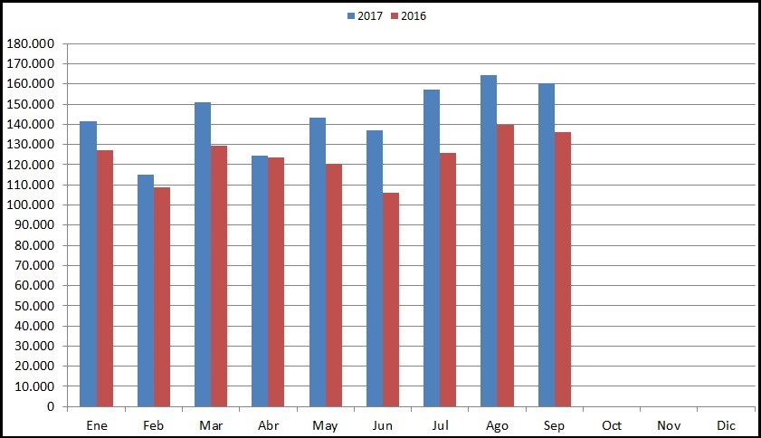 En los primeros 9 meses del año se vendieron 1.293.786 unidades, una suba del 15,81% comparado con igual período del año pasado (1.117.119 vehículos). Si lo comparamos con el mes de agosto (164.440 unidades) la baja llega al 2,36%.