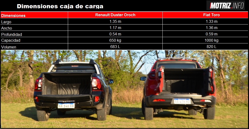 La diferencia más notable entre ambas se da en sus cajas de carga, donde es la Toro la que sale mejor parada, no solo porque tiene un mayor volumen de carga (820 litros) que la Oroch (683 litros), sino porque es la de mayor capacidad de carga: 1 tonelada VS los 650 kilos.