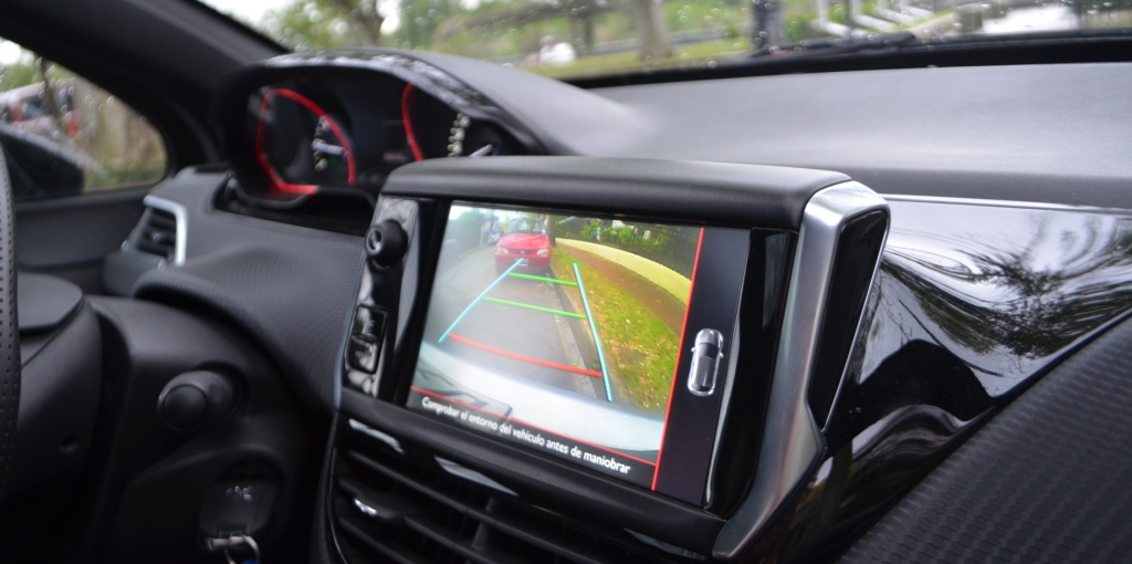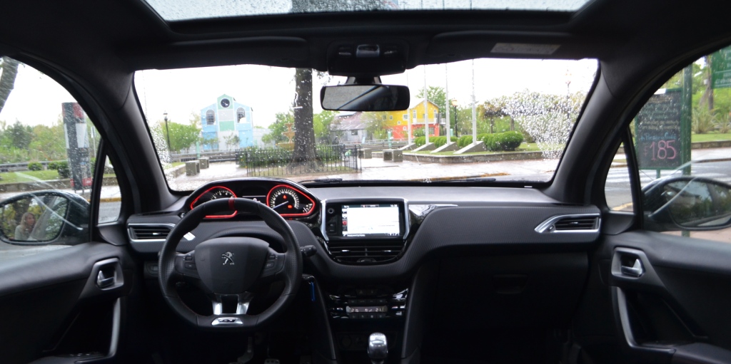 Por dentro encontramos detalles que intentan destilar deportividad, pero siempre en dosis muy escuetas. Así, aparece la luz roja en torno a los dos cuadrantes del tablero, como también así, detalles en símil fibra de carbono en el panel de instrumentos. El volante del 208 es por si deportivo (de aro chico, forrado en cuero con apliques en cromo), pero en este caso suma empuñaduras más anatómicas. La pantalla central es igual al resto de sus hermanos sosegados, con la novedad de que incorpora cámara de retroceso. Como elemento de confort, dispone de techo panorámico fijo con un efectivo sistema de persiana que lo cubre en su totalidad.