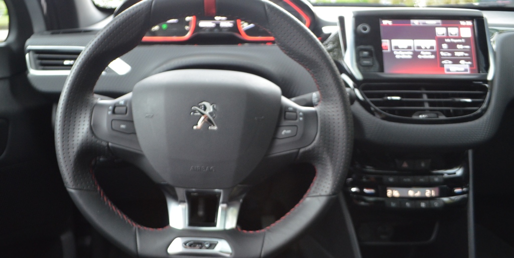 La postura de manejo ya marca una diferencia con respecto a los 208 citadinos a causa de sus butacas con mejor agarre en los laterales. No acompaña esta postura su pedalera poca profunda. Quienes viajen atrás, seguirán teniendo un espacio muy comprimido tanto para las rodillas como para la cabeza con respecto al techo. Es para destacar que en ese sector cuenta con tres apoya cabezas y tres cinturones inerciales. El tirón de oreja se lo lleva la ausencia de ganchos. Su comportamiento dinámico en ciudad es excelente; pese a sus neumáticos de perfil bajo, no es un auto áspero. Su amortiguación es diferente al resto de los 208 y eso hace que no se incline demasiado en curvas rápidas.