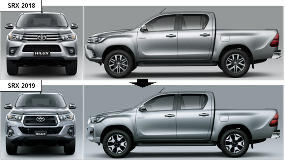 Toyota presentó una actualización para la octava generación de la Hilux que llegó al mercado en 2015, producida en la planta de Zárate, provincia de Buenos Aires. Este nuevo modelo, con cambios bien notables en el frontal, incorpora nueva parrilla, pero la misma se incorpora únicamente a las versiones tome de gama: SR, SRV y SRX, mientras que conserva la conocida hasta el momento en la versión DX. La nueva parrilla se caracteriza su diseño hexagonal cruzada por tres barras horizontales cerradas por un contorno cromado, que acompaña también un nuevo diseño de paragolpes delantero, en el que se incorporan los faros antiniebla; este último se suma como nuevo equipamiento para las versiones SR.  Como resultado de estas modificaciones, la Hilux 2019 tiene una longitud de 5.315mm, 15mm más corta que el modelo 2018. El alto (1.815mm) y el ancho (1.855mm) mantienen la misma medida, al igual que la distancia entre ejes (3.085mm). Adicionalmente, las versiones Hilux SRX son ahora equipadas con llantas de 18” de nuevo diseño, como diferenciador de las demás integrantes de la gama. Por dentro, las modificaciones recaen únicamente en las versiones SRX, con el fin de realzar su imagen como referente del segmento.  En el habitáculo predominan los tonos oscuros en contraste con detalles cromados, asientos de cuero perforado y un nuevo tablero de instrumentos con iluminación blanca. A su equipamiento, se agrega un espejo interior electrocrómico y un diseño exclusivo para la Smart key.