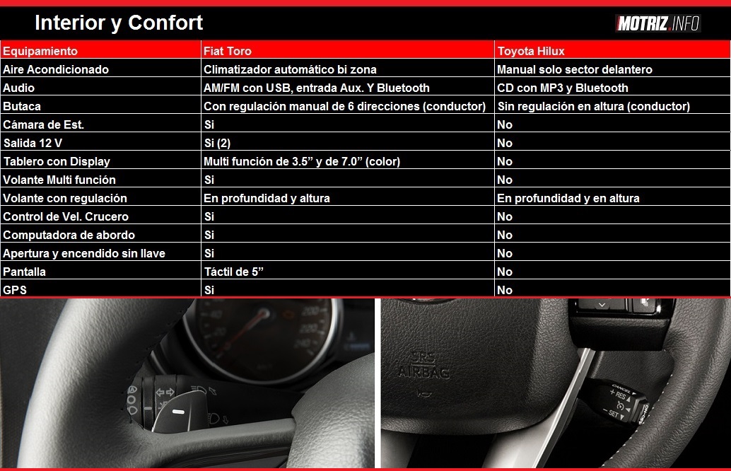 a favor de la Toro, la cual ofrece un amplio abanico de soluciones, aventajando a la Hilux DX. Se trata de uno de los fundamentos fuertes en lo que se puede basar la elección de compra de la pick up de Fiat, sobre la de Toyota, siempre pensando en los precios (la SRV o SRX son más equipadas pero se incrementa su valor más de $150.000). Aquí el listado con sus principales diferencias.