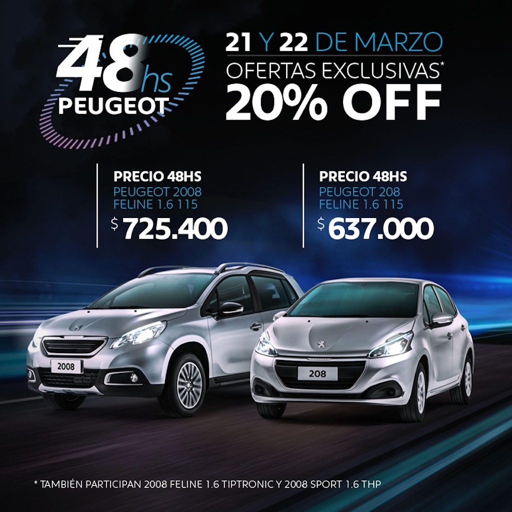 ofertas que podrán ser reservadas a través del E-Store (www.peugeotstore.com.ar/48hs) o de la Tienda Oficial de Mercado Libre (www.mercadolibre.com.ar/peugeot ) son las siguientes: